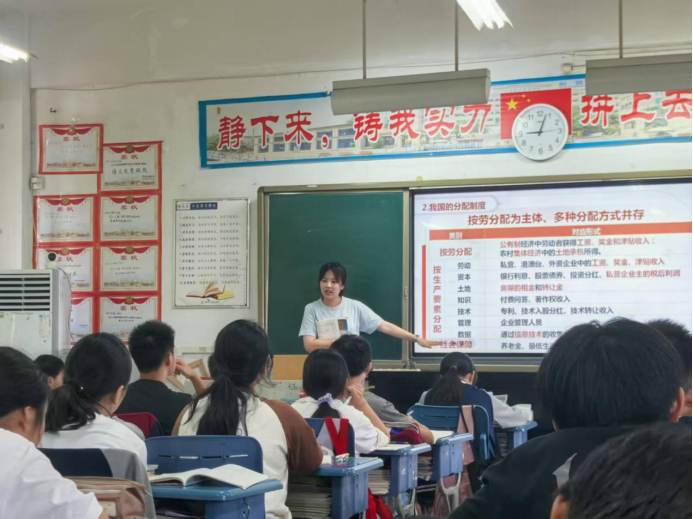 22级2班学生唐郁蕾同学在普明中学实习,担任高一年级十八班思政教师与实习班主任。实习期间,她始终以“踏实做好每一步”为准则:备课中,细致梳理教材,整合资源并反复试讲;课堂上,关注学生反应,用生活化案例解释抽象概念,耐心调整节奏确保学生理解;课后认真批改作业、答疑解惑,并常旁听优秀教师课程以改进教学。作为班主任,她每日早到督学,课间主动与学生交流,疏导情绪。她组织学生主导班会,妥善调解矛盾,在平凡点滴中走进学生内心。唐郁蕾深知教育在于日积月累,她用心对待每节课、每个学生,那些早读的叮嘱、课堂的讲解与课后的倾听,正是她作为思政教师扎实成长的脚印。